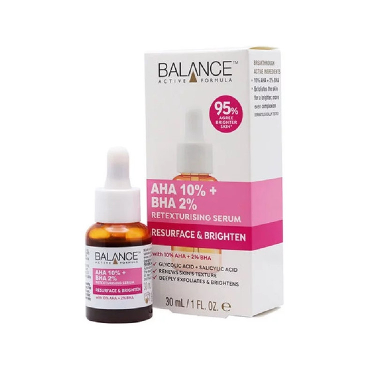 سرم لایه بردار و بازسازی کننده بالانس حاوی 10 درصد آلفاهیدروکسی اسید(AHA) و 2 درصد بتاهیدروکسی اسید(BHA) یکی از این لایه بردارهای شیمیایی میباشد. ترکیبات این سرم موجب لایه برداری پوست شده و رنگ آن را روشن میکند؛ در عین حال باعث بافت پوست را بهبود بخشیده و باعث جوانسازی نیز میشود.